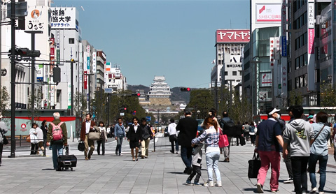 Le chateau de HIMEJI tel qu'il est visible dès la sortie de la gare.